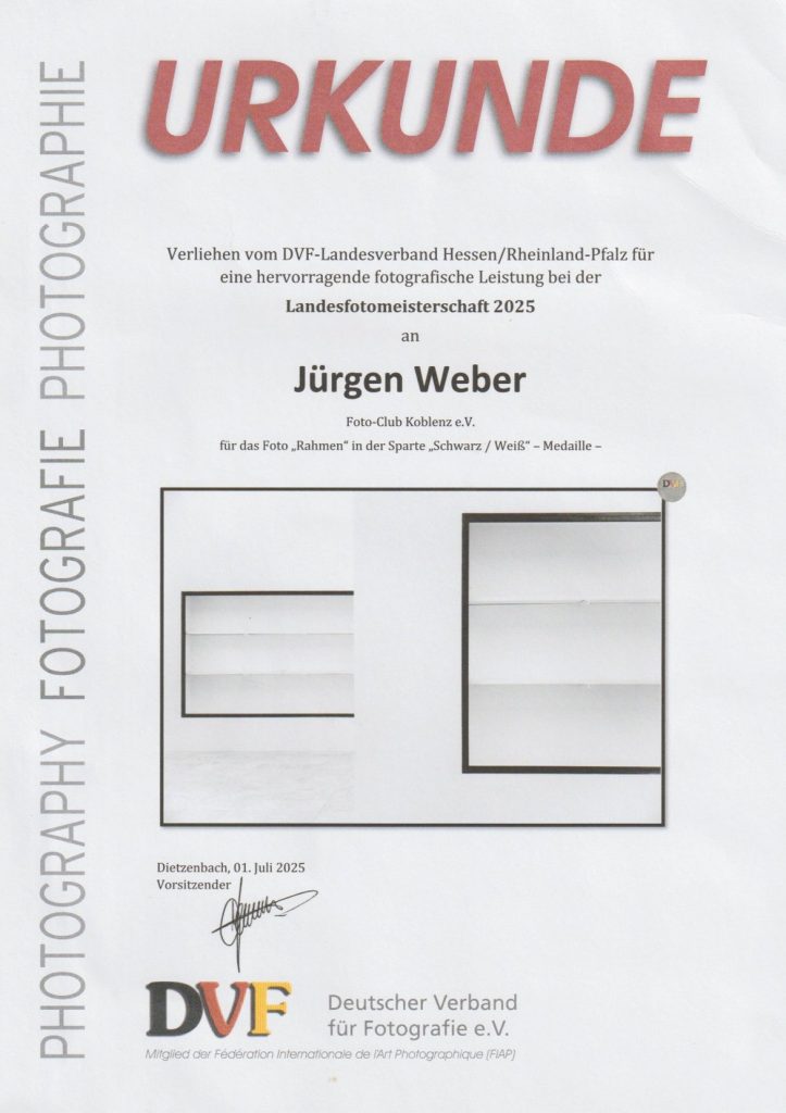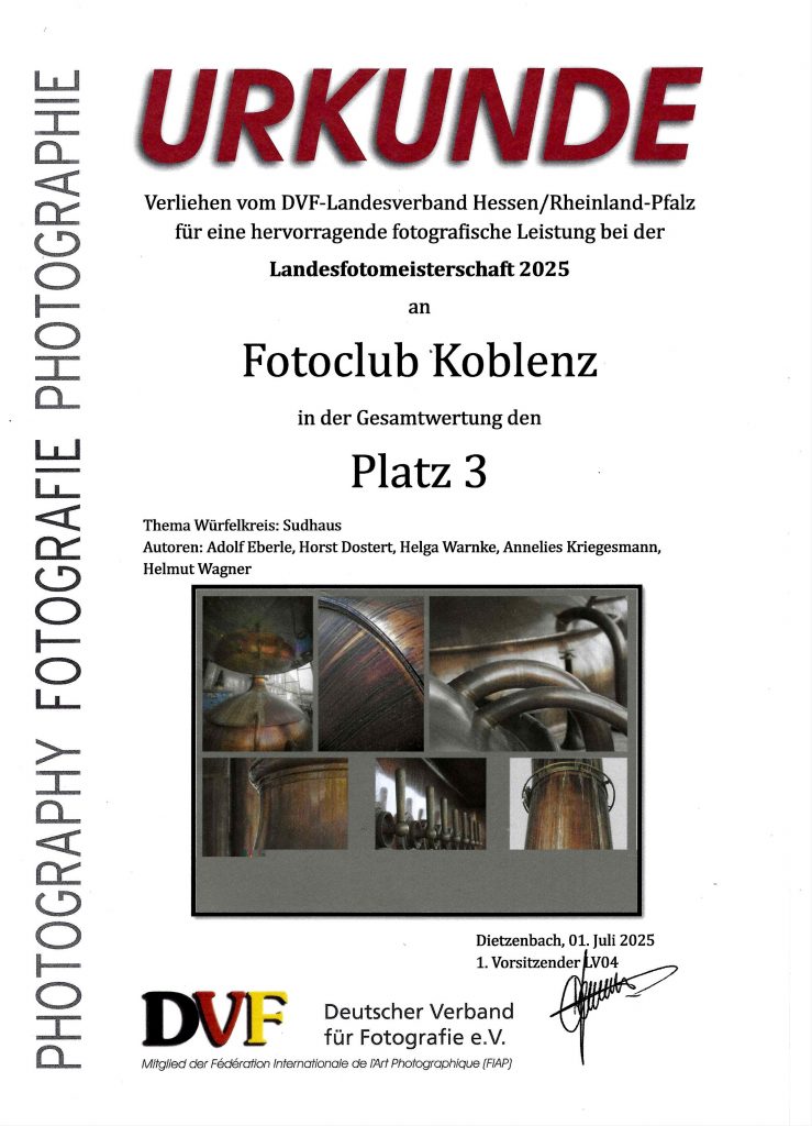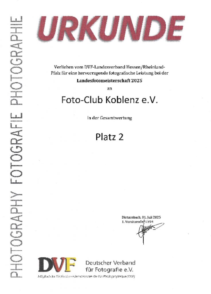 Der Foto-Club-Koblenz hatte mit sechs Mitgliedern am 21.07.2025 beim LAFO2025 mit etlichen Bildbeiträgen teilgenommen. Dieses Jahr wurde dieser Wettbewerb vom DVF Hessen/Rheinland-Pfalz ausgerichtet.