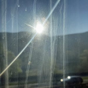 Glas, ein durchsichtiger Gegenstand, Gardine, Folie oder ähnliches.